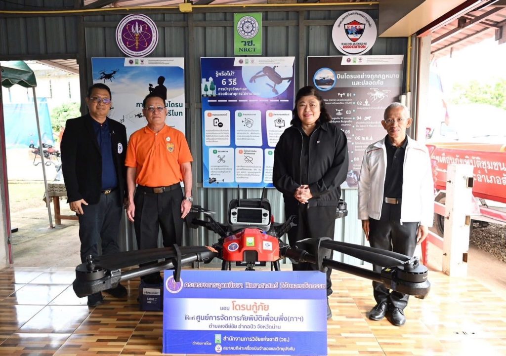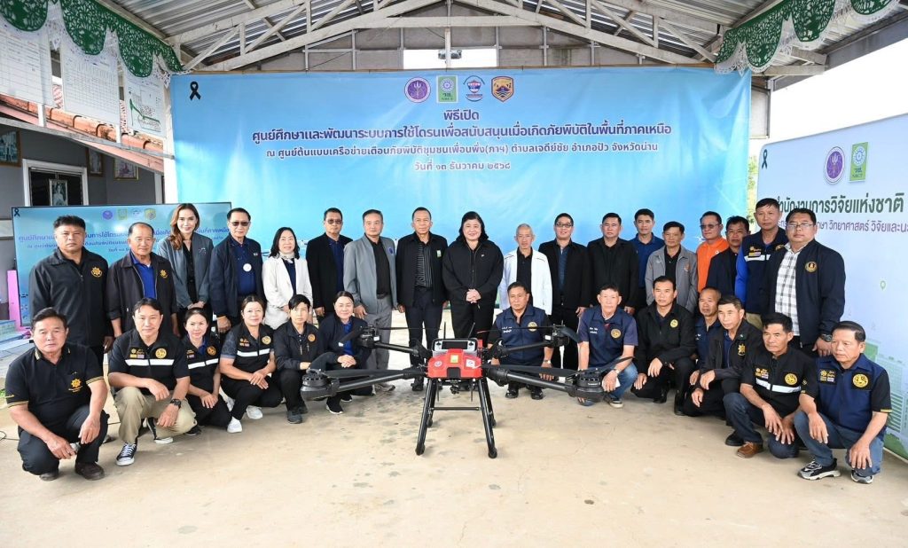 เมื่อวันที่ 13 ธันวาคม 2568 : สำนักงานการวิจัยแห่งชาติ(วช.) กระทรวงการอุดมศึกษา วิทยาศาสตร์ วิจัยและนวัตกรรม ร่วมกับ สมาคมกีฬาเครื่องบินจําลองและวิทยุบังคับ จัด “พิธีเปิดการจัดตั้งศูนย์ศึกษาและพัฒนาระบบการใช้โดรนเพื่อสนับสนุนเมื่อเกิดภัยพิบัติในพื้นที่ภาคเหนือ” โดย ดร.วิภารัตน์ ดีอ่อง ผู้อำนวยการสำนักงานการวิจัยแห่งชาติ เป็นประธาน พร้อมด้วย นายอิทธิฤทธิ์ ยะแสง กํานันตําบลเจดีย์ชัยและหัวหน้าศูนย์การจัดการภัยพิบัติตําบลเจดีย์ชัย กล่าวขอบคุณ, นายพิศิษฐ์ มิตรเกื้อกูล นายกสมาคมกีฬาเครื่องบินจําลองและวิทยุบังคับ กล่าวถึงที่มาของโครงการ, นายสมเกียรติ สุขโข ปลัดอาวุโสอำเภอปัว กล่าวต้อนรับ และผู้ทรงคุณวุฒิ วช. เข้าร่วมในพิธี ณ ศูนย์ต้นแบบเครือข่ายเตือนภัยพิบัติชุมชนเพื่อนพึ่ง(ภาฯ) ตําบลเจดีย์ชัย อําเภอปัว จังหวัดน่าน