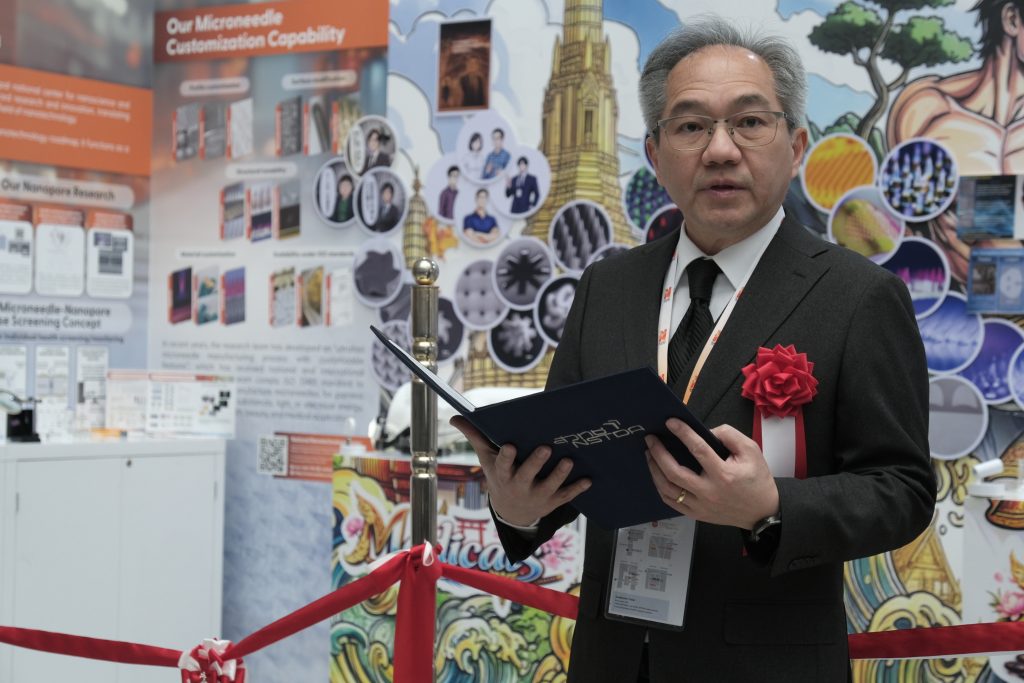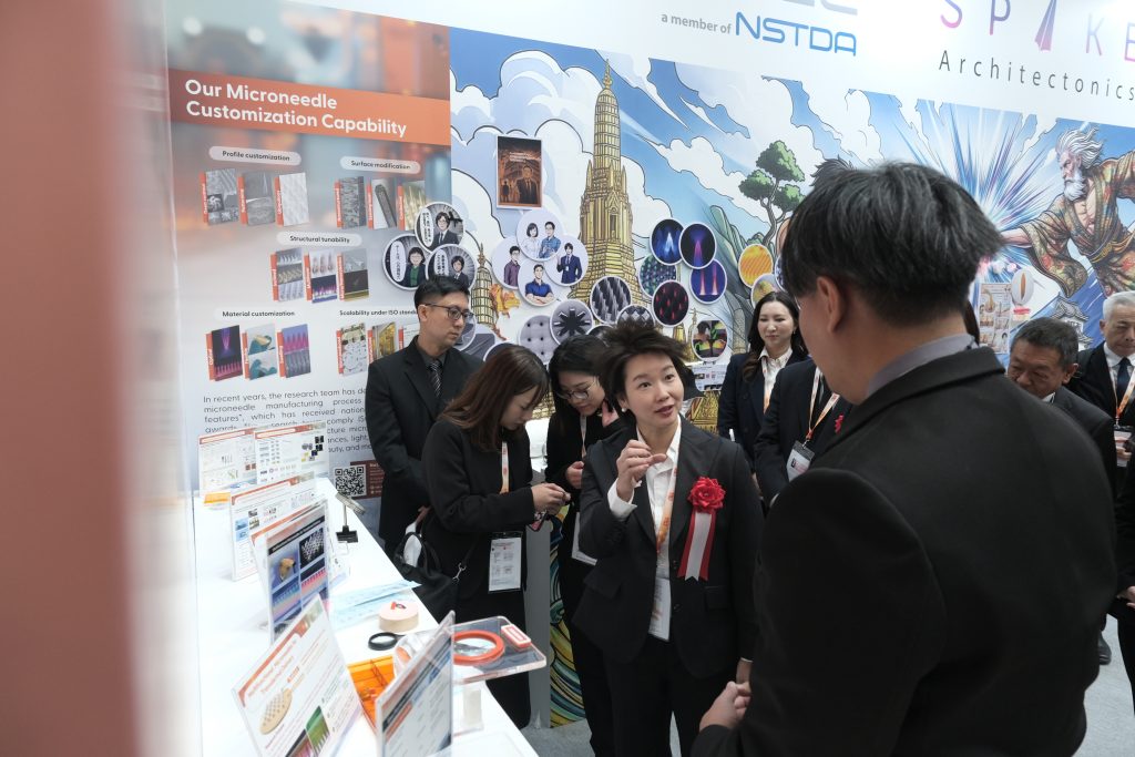 ดร.ภญ. อุรชา รักษ์ตานนท์ชัย ผู้อำนวยการศูนย์นาโนเทคโนโลยีแห่งชาติ (นาโนเทค) สวทช. กล่าวว่า ภายในงานนี้ นาโนเทคได้ร่วมนำเสนองานวิจัยการพัฒนาเข็มขนาดไมโครเมตร ผ่าน Microspike Technology Pavilion ร่วมกับบริษัทสตาร์ตอัป นับเป็นตัวอย่างที่ชัดเจนของการนำผลงานวิจัยต่อยอดสู่การใช้ประโยชน์เชิงพาณิชย์ อาทิ เทคโนโลยีไมโครนีดเดิลสำหรับการทดสอบภูมิแพ้ผ่านผิวหนัง การเก็บตัวอย่างของไหลระหว่างเซลล์ใต้ผิวหนัง การนำส่งสารและแสงผ่านผิวหนัง แพลตฟอร์มนาโนพอร์สำหรับการตรวจวัดสิ่งบ่งชี้ทางชีวภาพ พร้อมกันนี้ยังมีการจัดแสดงผลิตภัณฑ์จาก บริษัท สไปก์ อาร์ชิ เทคโทนิคส์ จำกัด ดีปเทคสตาร์ตอัป สวทช. ที่ได้นำงานวิจัยต่อยอดไปสู่ “เทคโนโลยีไมโครสไปก์” และพันธมิตรจากประเทศญี่ปุ่น บริษัท Furutaka Electronics Co., Ltd. ซึ่งสะท้อนให้เห็นถึงการเชื่อมโยงอย่างเป็นรูปธรรมระหว่างงานวิจัยกับโอกาสทางธุรกิจ