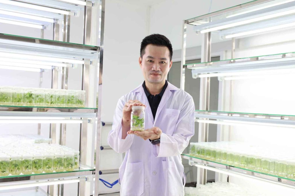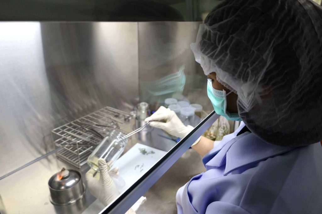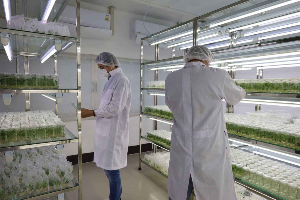 ดร.ยินดี ชาญวิวัฒนา นักวิจัย และทีมวิจัยธนาคารเนื้อเยื่อพืช ไบโอเทค กล่าวว่า เทคโนโลยี Tissue Culture เป็นนวัตกรรมการขยายพันธุ์พืชในสภาพปลอดเชื้อ โดยการนำเนื้อเยื่อเจริญส่วนปลายยอดของมันสำปะหลังมาเลี้ยงบนอาหารสังเคราะห์ในห้องปฏิบัติการที่ควบคุมสภาพแวดล้อมอย่างเข้มงวด เทคโนโลยีนี้มีหัวใจสำคัญอยู่ที่การตัดวงจรโรคระบาด เนื่องจากช่วยให้สามารถผลิตต้นแม่พันธุ์สะอาด ที่ปราศจากเชื้อไวรัสใบด่างได้แบบ 100% ทั้งยังสามารถทวีคูณจำนวนต้นพันธุ์ได้มหาศาลอย่างรวดเร็วโดยไม่ต้องรอฤดูกาล ซึ่งต้นพันธุ์ที่ได้จะมีลักษณะทางพันธุกรรมเหมือนต้นแม่พันธุ์ทุกประการ และมีความสม่ำเสมอทุกต้น พร้อมสำหรับกระบวนการอนุบาลและขยายจำนวนสู่มือเกษตรกรในสเกลที่ใหญ่ขึ้นต่อไป