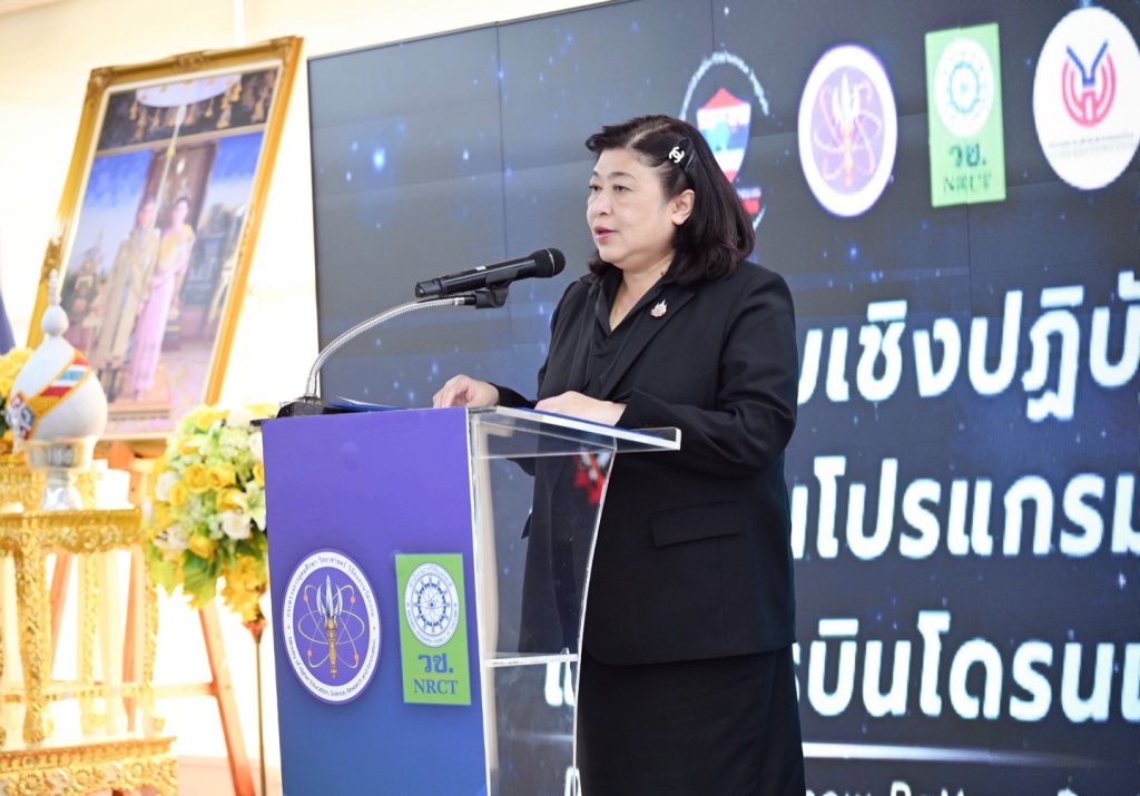 ดร.วิภารัตน์ ดีอ่อง ผู้อำนวยการสำนักงานการวิจัยแห่งชาติ กล่าวว่า วช. ให้ความสำคัญกับการพัฒนาทรัพยากรมนุษย์ด้านวิทยาศาสตร์ วิจัย และนวัตกรรม โดยการจัดอบรมถ่ายทอดองค์ความรู้ด้านการเขียนโปรแกรมออกแบบแผนการบินโดรนแปรอักษร เป็นกระบวนการบูรณาการองค์ความรู้ด้านวิศวกรรม การเขียนโปรแกรม คณิตศาสตร์ การวางแผนเชิงระบบ และความปลอดภัย เพื่อยกระดับทักษะผู้ปฏิบัติสู่การประยุกต์ใช้เทคโนโลยีอย่างมีประสิทธิภาพ และงานสร้างสรรค์ พร้อมทั้งส่งเสริมการต่อยอดสู่การพัฒนางานวิจัยและนวัตกรรมที่ก่อให้เกิดประโยชน์ต่อสังคมและประเทศ