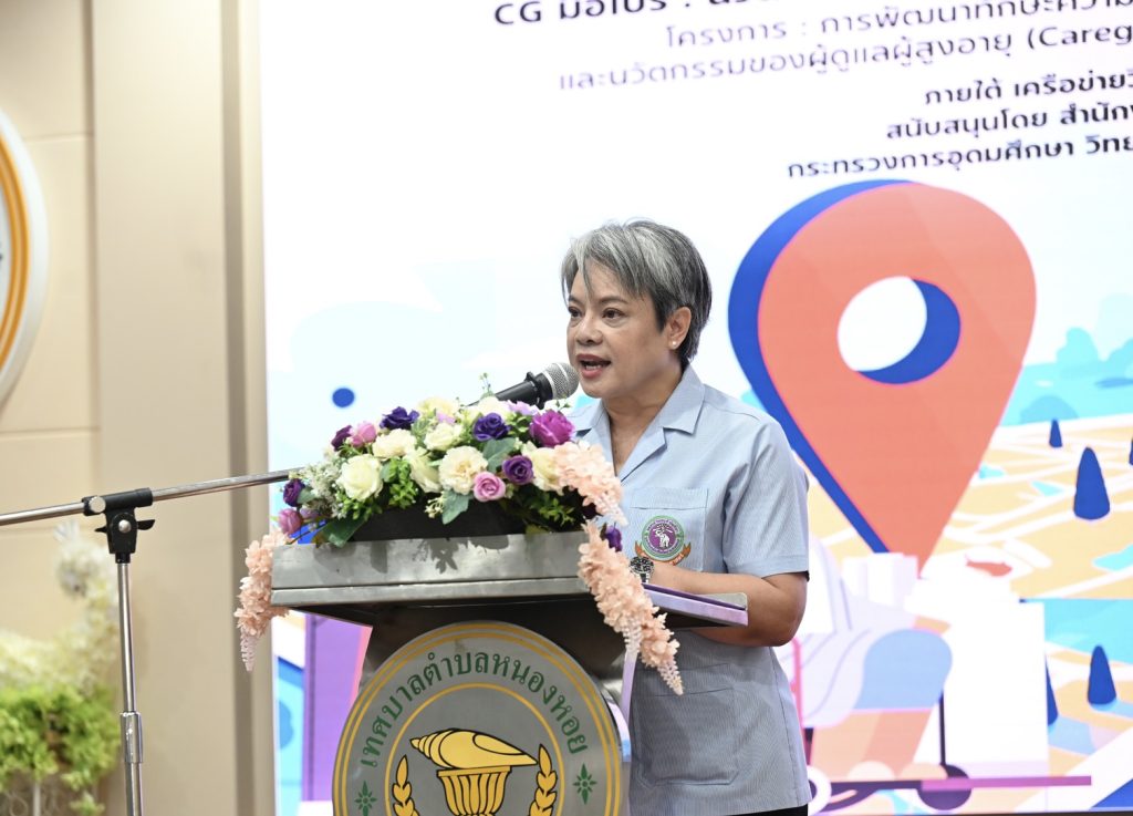 นางดรุณี สามใบ ผู้แทน Care giver เทศบาลตำบลหนองหอย กล่าวขอบคุณ วช. คณะนักวิจัย และทุกภาคีเครือข่าย ที่ได้พัฒนาองค์ความรู้ เทคโนโลยี และนวัตกรรมเพื่อสนับสนุนการทำงานของผู้ดูแลผู้สูงอายุ การได้เรียนรู้และใช้เครื่องมือ เช่น แอปพลิเคชัน Caregiver 4.0 ช่วยให้การดูแลผู้สูงอายุมีความเป็นระบบ มั่นใจ และปลอดภัยมากยิ่งขึ้น และพร้อมที่จะนำความรู้ที่ได้รับไปพัฒนาการดูแลผู้สูงอายุในชุมชนให้ดียิ่งขึ้น เพื่อคุณภาพชีวิตที่ดีและยั่งยืนของผู้สูงอายุในชุมชน