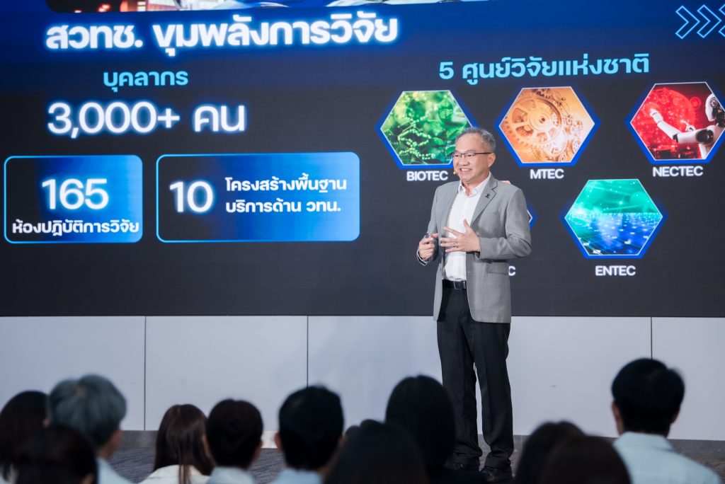 ศาสตราจารย์ ดร.ชูกิจ ลิมปิจำนงค์ ผู้อำนวยการ สวทช. แถลงว่า ในยุคที่ความยั่งยืนกลายเป็นกติกาใหม่ของโลก และไม่ใช่ทางเลือกอีกต่อไป แต่คือเงื่อนไขของการอยู่รอด และวิทยาศาสตร์คือ “เครื่องมือสำคัญที่สุด” ที่ทำให้ความยั่งยืนเกิดขึ้นได้จริง โดยมีตัวอย่างของทีมวิจัย สวทช. ดำเนินการใช้เทคโนโลยีเกษตรอัจฉริยะช่วยแก้ปัญหาการปนเปื้อนแมลงและสารเคมี เพื่อส่งกะเพราไทยสู่ตลาดโลก ด้วยการปลูกและควบคุมคุณภาพ สอดคล้องกับศักยภาพของผู้ประกอบการทั้งขนาดใหญ่ ขนาดกลาง และขนาดเล็ก นอกจากนี้ในเรื่องของ ‘มาตรการปรับคาร์บอนก่อนข้ามพรมแดน ‘CBAM’ (‘Carbon Border Adjustment Mechanism’) ที่สหภาพยุโรป (EU) กำหนดขึ้นเพื่อมุ่งสร้างการเติบโตทางเศรษฐกิจอย่างเป็นมิตรกับสิ่งแวดล้อมแก่ประเทศคู่ค้านอกสหภาพยุโรป ในเรื่องนี้ สวทช. โดยสถาบันเทคโนโลยีและสารสนเทศเพื่อการพัฒนาที่ยั่งยืน (TIIS) ได้ดำเนินการจัดทำฐานข้อมูลสิ่งแวดล้อมให้แก่กลุ่มอุตสาหกรรมอะลูมิเนียม และเหล็ก เพื่อเป็นฐานข้อมูลกลางของประเทศ และช่วยสนับสนุนผู้ประกอบการในการจัดทำรายงาน CBAM เพื่อฝ่ากำแพงภาษียุโรปได้อย่างยั่งยืน