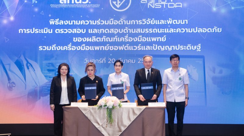 (วันที่ 20 มีนาคม 2569) ณ โรงแรมแมนดาริน กรุงเทพฯ: กระทรวงการอุดมศึกษา วิทยาศาสตร์ วิจัยและนวัตกรรม (อว.) สำนักงานพัฒนาวิทยาศาสตร์และเทคโนโลยีแห่งชาติ (สวทช.) โดย ศูนย์เทคโนโลยีอิเล็กทรอนิกส์และคอมพิวเตอร์แห่งชาติ (เนคเทค) ร่วมกับ สำนักงานคณะกรรมการอาหารและยา (อย.) สำนักงานเทคโนโลยีและนวัตกรรมด้านชีววิทยาศาสตร์ (องค์การมหาชน) (สทนว.) และรังสีวิทยาสมาคมแห่งประเทศไทย (รสท.) จัด “AISaMD Demo Day: The first step ผลิตภัณฑ์ AI เครื่องมือแพทย์ไทย มุ่งสู่มาตรฐานในระดับสากล” ชูไฮไลต์ 5 ผลิตภัณฑ์ AI การแพทย์ที่ผ่านการทดสอบตามมาตรฐานสากล พร้อมประกาศลงนามความร่วมมือ 2 ฉบับสำคัญ ได้แก่ 1. การลงนามความร่วมมือด้านการวิจัยและพัฒนาการประเมิน ตรวจสอบ และทดสอบด้านสมรรถนะและความปลอดภัยของผลิตภัณฑ์เครื่องมือแพทย์รวมถึงเครื่องมือแพทย์ซอฟต์แวร์และปัญญาประดิษฐ์ ระหว่าง สทนว. สวทช. และ อย. และ 2.การลงนามความร่วมมือภายใต้โครงการพัฒนาหลักเกณฑ์และบริการทดสอบ สำหรับผลิตภัณฑ์ปัญญาประดิษฐ์เครื่องมือแพทย์ตามมาตรฐานสากล ระหว่าง เนคเทค-สวทช. และ รทส. เพื่อวางโครงสร้างพื้นฐานด้านการตรวจสอบและกำกับดูแลนวัตกรรมทางการแพทย์ของประเทศ