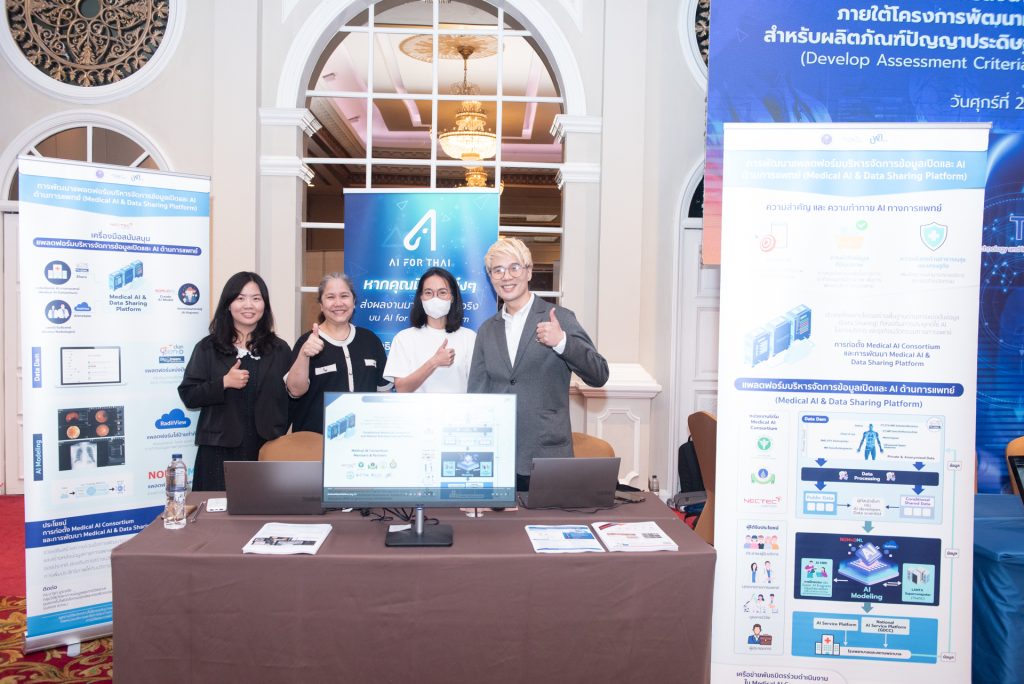 ทั้งนี้ภายในงานมีการจัดแสดงผลงาน 5 ผลิตภัณฑ์ AI เครื่องมือแพทย์ที่ผ่านการทดสอบตามมาตรฐานสากลและพร้อมก้าวสู่การขึ้นทะเบียนเครื่องมือแพทย์ ได้แก่ ‘BITNET’ ระบบคัดกรองความผิดปกติในช่องท้องส่วนบนแบบเรียลไทม์ที่ช่วยแยกกลุ่มโรคได้แม่นยำถึง 14 กลุ่ม ‘TrueEye Health Screening’ แอปพลิเคชันประเมินความเสี่ยงโรคเบาหวานขึ้นจอตาและโรคไตเรื้อรังจากรูปถ่ายจอประสาทตา ‘AI Hip Fracture Detection’ ที่ใช้ตรวจจับและระบุตำแหน่งกระดูกสะโพกหักจากภาพเอกซเรย์ ‘Liversound’ ระบบช่วยคัดกรองมะเร็งตับด้วยอัลตราซาวด์ที่มาพร้อมระบบแจ้งเตือนเมื่อพบรอยโรคที่มีความเสี่ยง และ ‘Aiceda BreastX’ แพลตฟอร์มคลาวด์สำหรับตรวจหามะเร็งเต้านมเบื้องต้นที่รองรับการประมวลผลภาพจำนวนมากและสามารถออกรายงานผลได้ทันที โอกาสนี้ขอเชิญชวนผู้ประกอบการ สตาร์ตอัป (Startup) นักพัฒนา และนักวิจัยที่มีนวัตกรรมปัญญาประดิษฐ์เครื่องมือแพทย์ เข้าร่วมประเมินและทดสอบผลิตภัณฑ์ในช่วงนำร่องกับทางโครงการฯ เพื่อประเมินความพร้อม รับคำปรึกษาที่สอดคล้องกับมาตรฐานสากล และเตรียมความพร้อมสู่การยื่นขอขึ้นทะเบียนเครื่องมือแพทย์กับ อย. ได้อย่างถูกต้องและมีประสิทธิภาพต่อไป