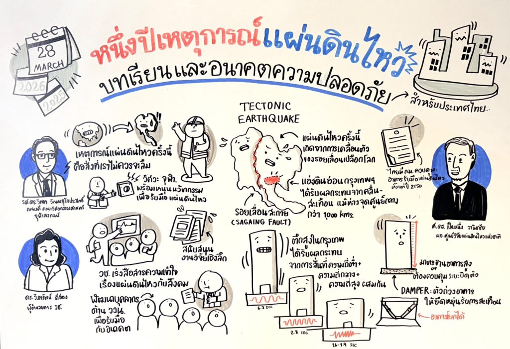 เมื่อวันที่ 31 มีนาคม 2569 : สำนักงานการวิจัยแห่งชาติ(วช.) กระทรวงการอุดมศึกษา วิทยาศาสตร์ วิจัยและนวัตกรรม ร่วมกับ ศูนย์วิจัยแผ่นดินไหวแห่งชาติ (EARTH) และคณะวิศวกรรมศาสตร์ จุฬาลงกรณ์มหาวิทยาลัย จัดงานประชุมวิชาการ “หนึ่งปีเหตุการณ์แผ่นดินไหว 28 มีนาคม 2568 : บทเรียนและอนาคตความปลอดภัยสำหรับประเทศไทย” (One Year After the March 28, 2025 Earthquake: Lessons Learned and Pathways Toward Safer Thailand) โดย ดร.วิภารัตน์ ดีอ่อง ผู้อำนวยการสำนักงานการวิจัยแห่งชาติ กล่าวเปิดงาน พร้อมด้วย รศ.ดร.วิทยา วัณณสุโภประสิทธิ์ คณบดีคณะวิศวกรรมศาสตร์ จุฬาลงกรณ์มหาวิทยาลัย กล่าวต้อนรับ, ศ.ดร.เป็นหนึ่ง วานิชชัย ผู้อำนวยการศูนย์วิจัยแผ่นดินไหวแห่งชาติ กล่าวถึงภาพรวมของความเสี่ยงแผ่นดินไหวในประเทศไทย, Mr. Kajiwara Toru อัครราชทูตและหัวหน้าฝ่ายเศรษฐกิจ สถานเอกอัครราชทูตญี่ปุ่น, รศ.ดร.ทวิดา กมลเวชช รองผู้ว่าราชการกรุงเทพมหานคร และ Prof. Shoji Gaku จาก University of Tsukuba ร่วมบรรยายพิเศษ ณ หอประชุมคณะวิศวกรรมศาสตร์ จุฬาลงกรณ์มหาวิทยาลัย