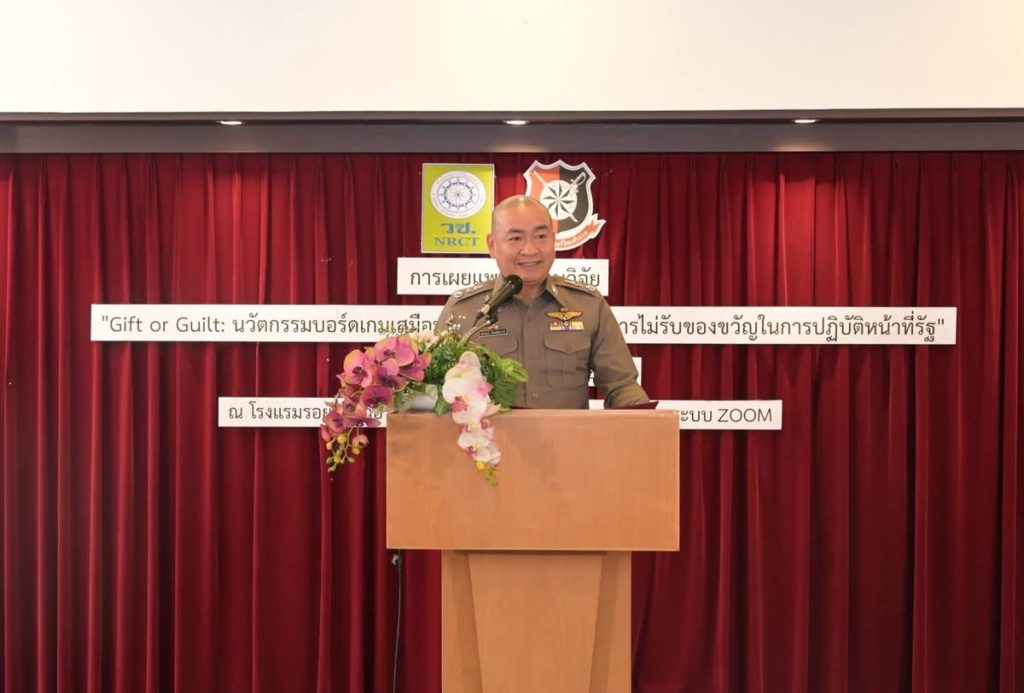 ต่อมา เป็นการนำเสนอผลการวิจัยโครงการ “การออกแบบและพัฒนาแพลตฟอร์มบอร์ดเกมเสมือนเพื่อสร้างองค์ความรู้และจัดทำมาตรการไม่รับของขวัญและของกำนัลในการปฏิบัติหน้าที่ของเจ้าหน้าที่รัฐ” โดย นายณัฐปกรณ์ ประเสริฐสุข เจ้าพนักงานป้องกันการทุจริตชำนาญการ สำนักงาน ป.ป.ช. และการแนะนำและร่วมกิจกรรมบอร์ดเกม “Gift or Guilt” และหลักสูตรออนไลน์ “No Gift Policy MOOC: แนวทางปฏิบัติและการขับเคลื่อนองค์กรโปร่งใส” โดย พันตำรวจโท วิชิต อาษากิจ โรงเรียนนายร้อยตำรวจ หัวหน้าโครงการ พร้อมด้วยการเสวนาในหัวข้อ “การบูรณาการงานวิจัยสู่การปฏิบัติ: ขับเคลื่อนมาตรการไม่รับของขวัญผ่านนวัตกรรมเกม” โดยได้รับเกียรติจากนายอุเทน กอวงษ์ สำนักงาน ป.ป.ช., ผศ.(พิเศษ) ว่าที่ร้อยโท ดร.เจนรบ พละเดช ผู้ตรวจสอบทางวิชาการ, นายกิตติเดช ฉันทังกูล Hand Social Enterprise สร้างธรรมาภิบาลและความโปร่งใส และนายมูฮัมหมัดกัยฟาน สาและ สภาเด็กและเยาวชนแห่งประเทศไทยร่วมแลกเปลี่ยนองค์ความรู้และประสบการณ์ในการขับเคลื่อนนโยบาย No Gift Policy เพื่อเสริมสร้างธรรมาภิบาลและความโปร่งใสในภาครัฐ